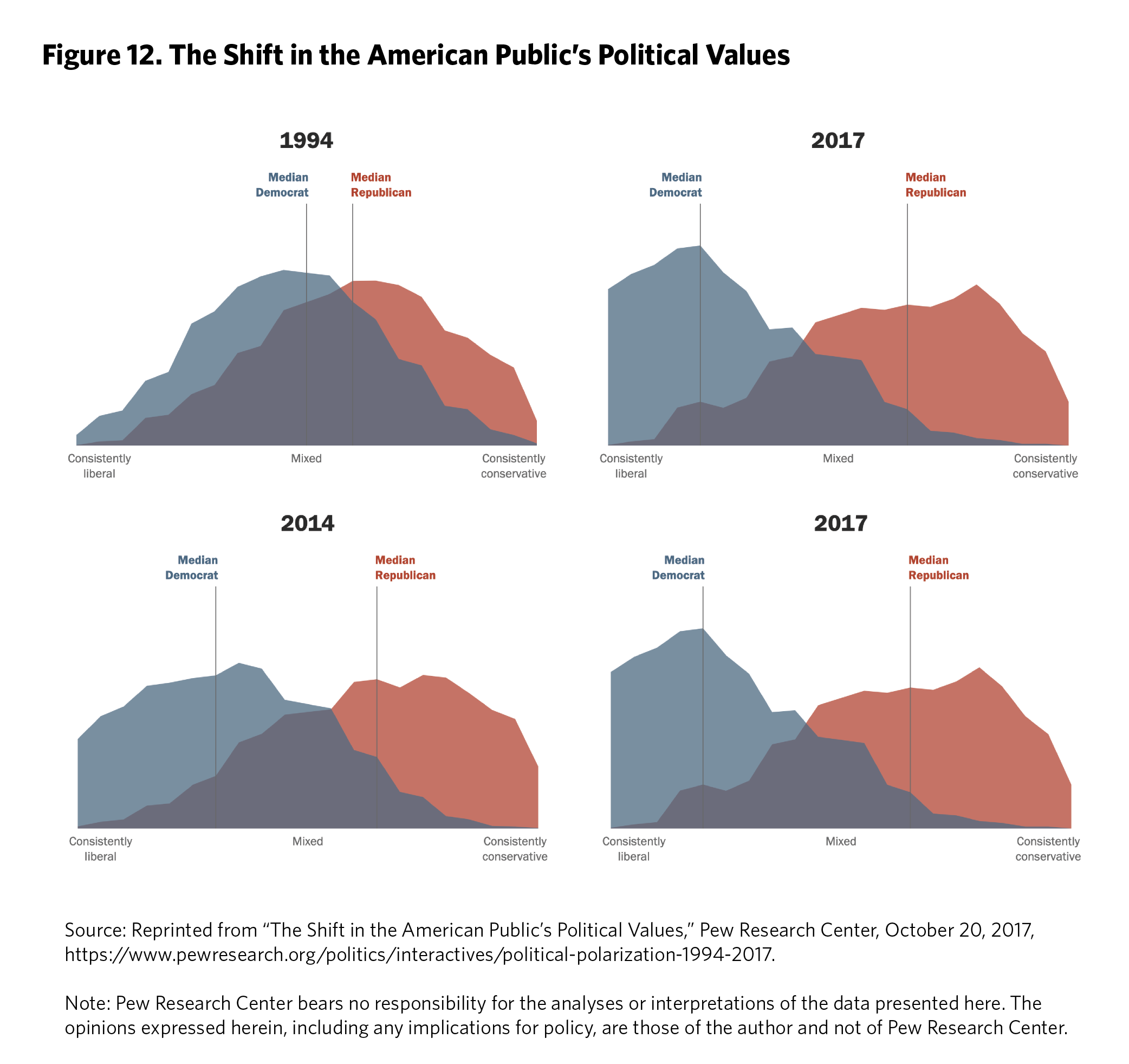 2. American politicians are highly ideologically polarized. In other words, they believe in and vote for different sets of policies, with little overlap. This trend has grown in a steady, unpunctuated manner for decades.5 One reason that the most highly politically engaged Americans may misunderstand the other side is that they correctly estimate the extreme ideological polarization among politicians.